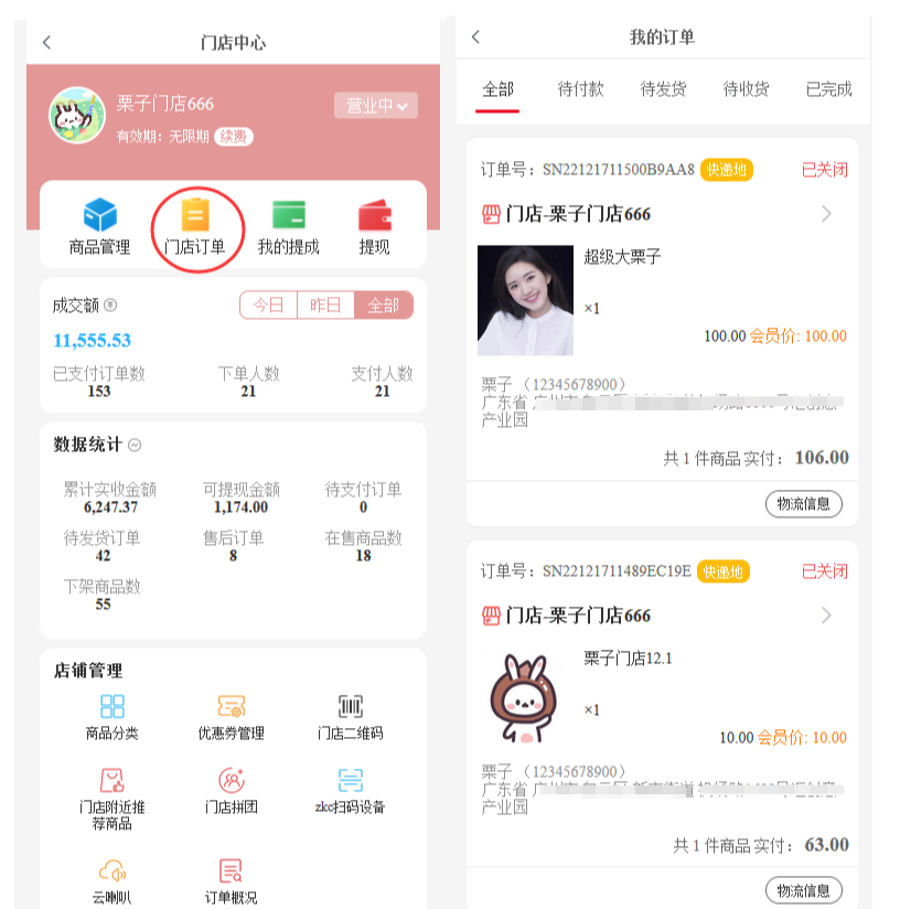 门店商品和收银台订单是区分开,在对应管理中点击查看
