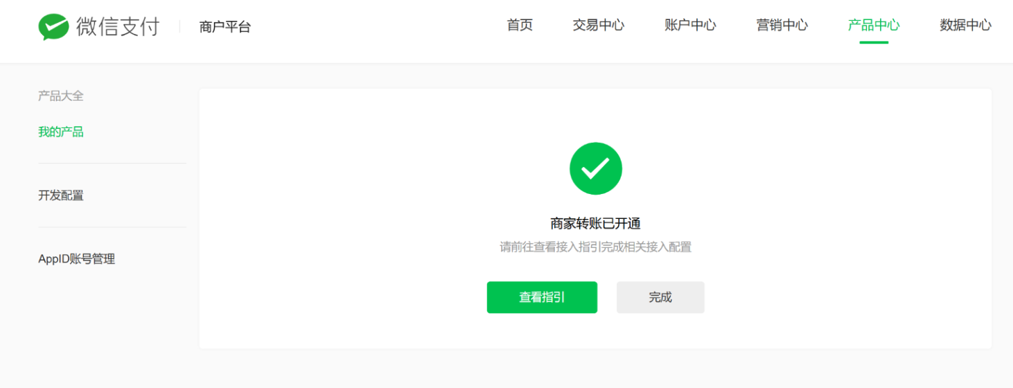 请前往微信支付商户平台> 产品中心 > 运营工具 > 商家转账 > 申请开通,按页面指引完成开通